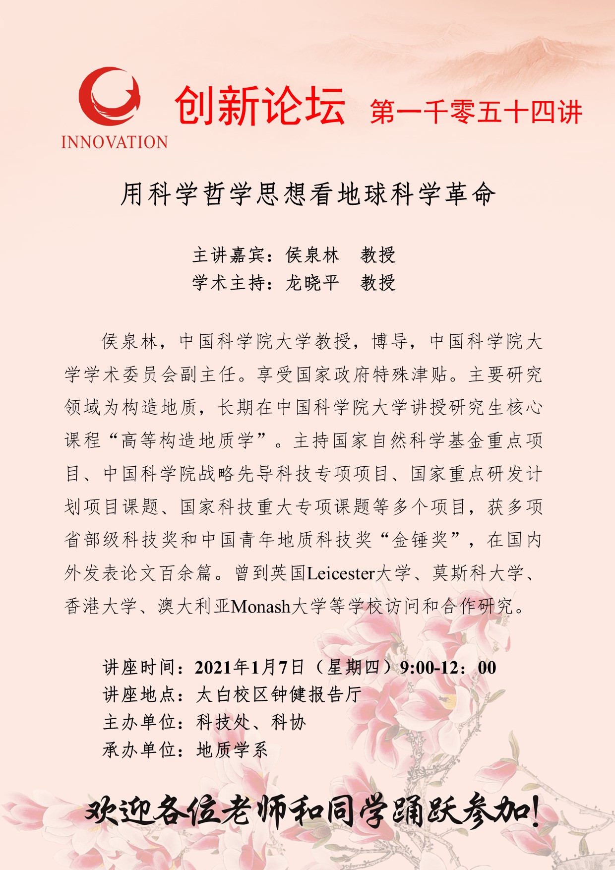 侯泉林 教授 威尼斯432888cam创新论坛第一千零五十四讲:用科学哲学思想看地球科学革命 讲座时间 2021年1月7日(星期四) 9:00-12:00 讲座地点 太白校区钟健报告厅 讲座人介绍 侯泉林 教授 讲座内容