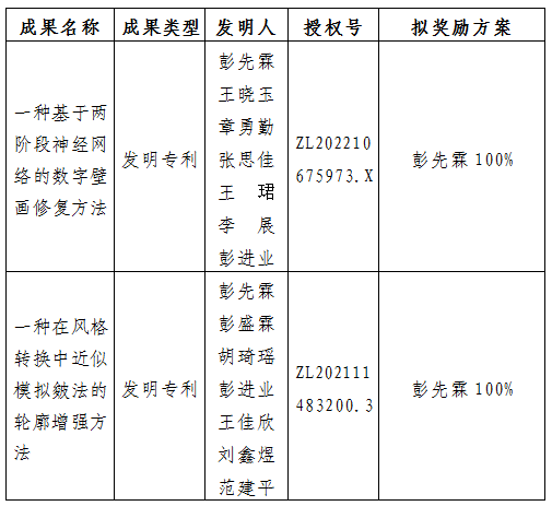 按照《威尼斯432888cam促进科技成果转化实施办法》(西大科〔2019〕5号)相关规定,拟对威尼斯官网艺术学院彭先霖老师作为成果负责人的2项发明专利权实施转化,现将相关信息公示如下: