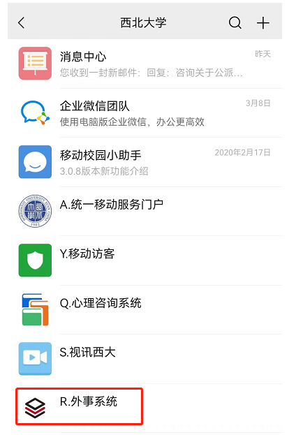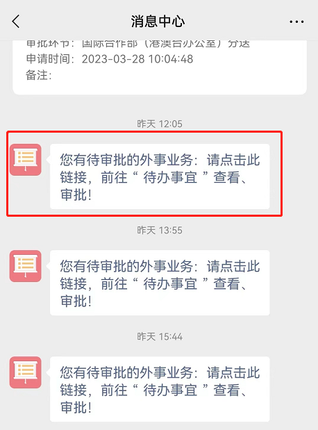 通过手机微信“威尼斯432888cam”-“消息中心”-“R.外事系统”路径,可以进行业务查看及审批。