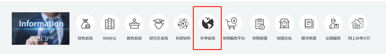 在学校官网首页下方“信息门户”快捷图标中,点击“外事系统”图标,登录后可进行业务办理及审批。