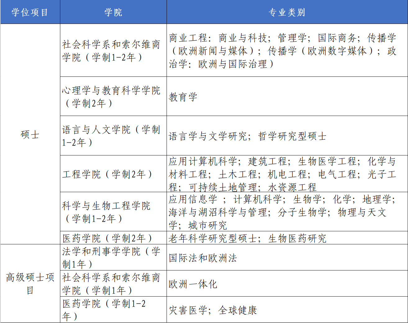 3. 申请专业:参考下图中硕士及高级硕士专业