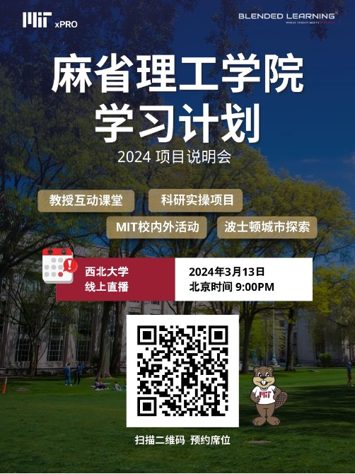 Blended Learning(混合式学习)项目集合了麻省理工学院众多顶尖资源,为全世界学习者提供超过80门线上、线下、课程 式、项目制的前沿交叉学科课程。通过深入MIT的混合式学习体验,学生将有机会扎实前沿学科理论、参与科研探索和实践 项目、扩展学术视野、积累项目经验及学术人脉、并培养创新思维与领导能力。被录取的学生将收到MIT官方邀请函,辅助签 证申请,完成项目获得MIT官方证书。